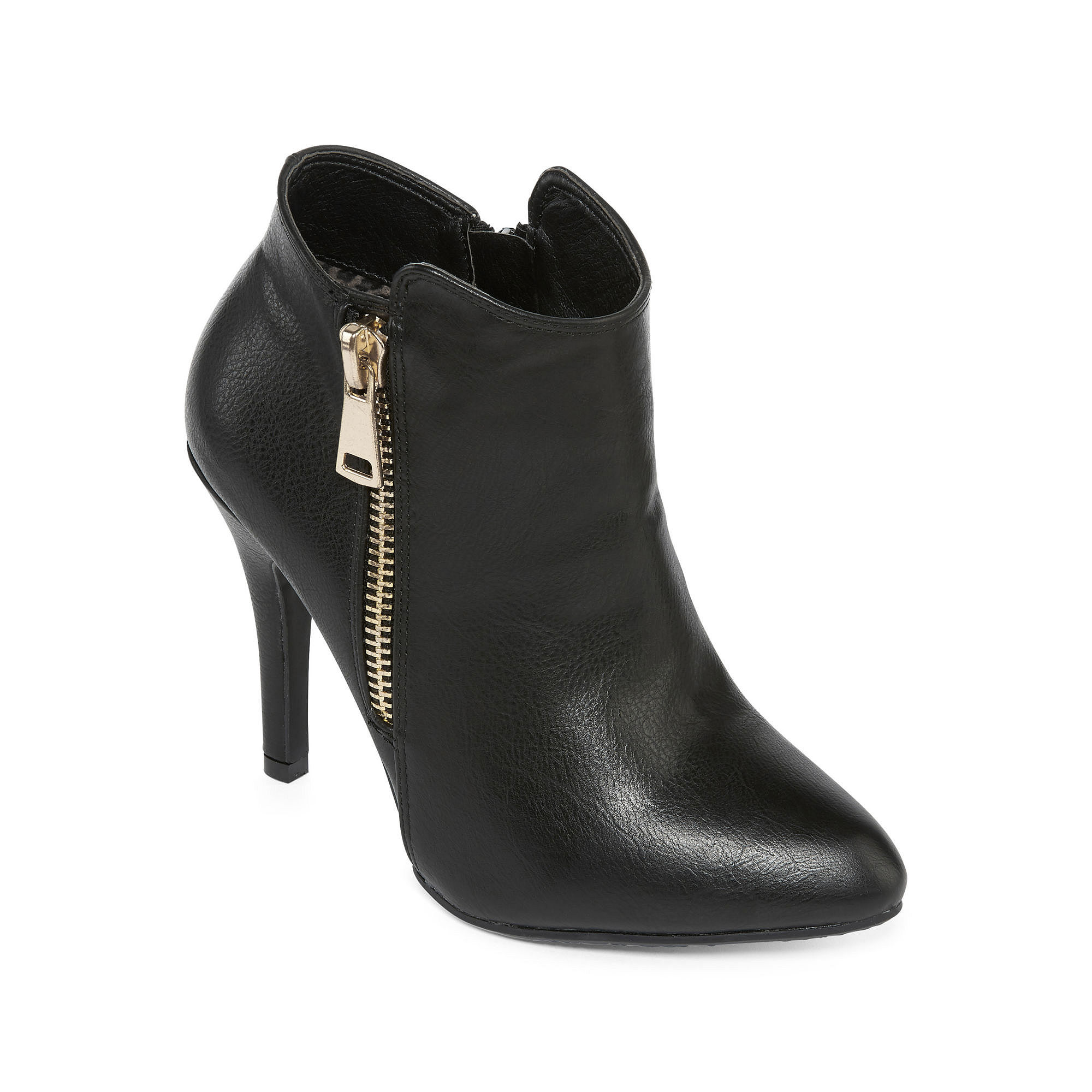 A pointed toe and decorative gold zipper take your look from casual to chic