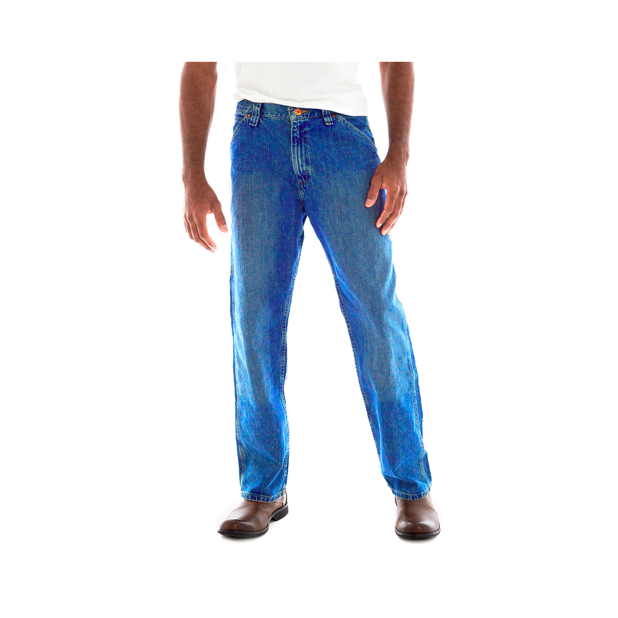 midweight cotton denim features extra side pocket and hammer loop classic utility styling sits just below waist loose fit through seat and thigh zip fly with button closure classic utility styling extra side pocket and hammer loop straight leg, 18" opening cotton washable imported